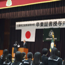当日は卒業生代表によるご挨拶も行われ、松阪高校の卒業生として皆様には自主自律の精神を持ちまして、今後の活動にご期待申し上げております。